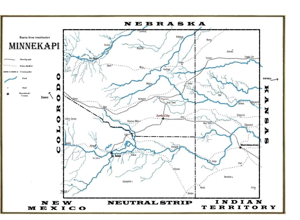 Delstaten Minnekapi gränsar i väster till Colorado, i öster till Kansas och i norr till Nebraska. I söder ligger ett neutralt område samt ett indianterritorium, som sedermera ska bli Oklahoma, söder om dessa områden ligger Texas. Minnekapi har också gräns till New Mexico i söder. Se karta.